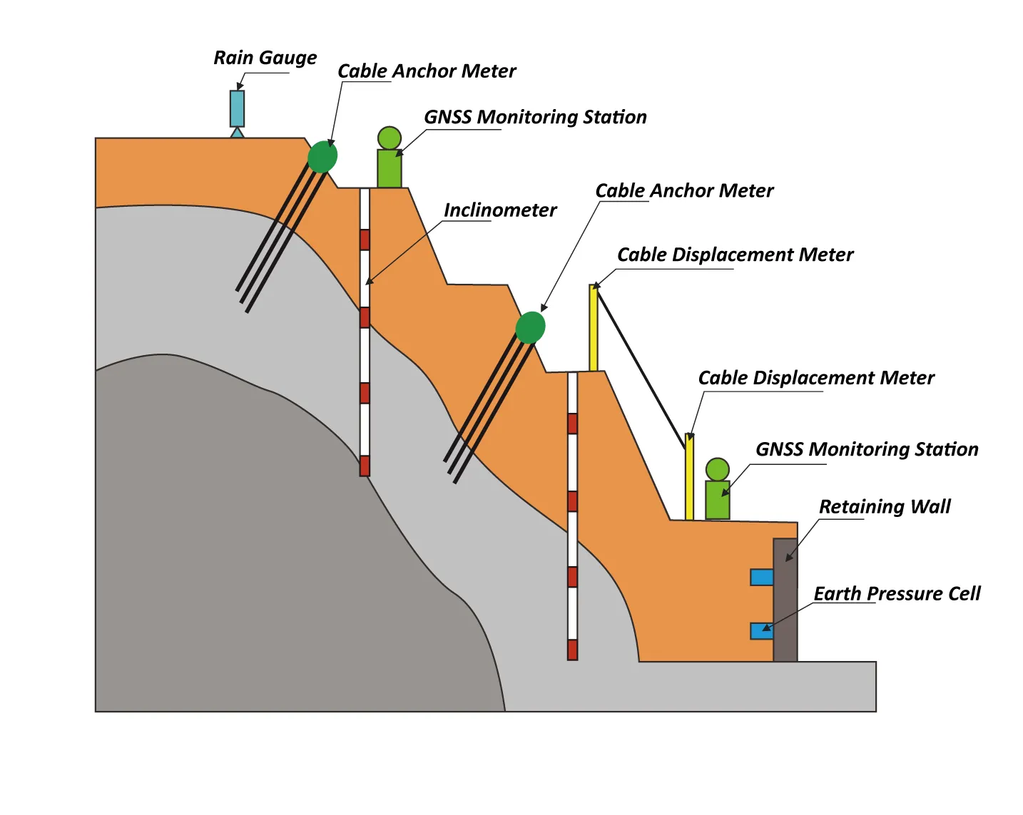গভীর স্থানচ্যুতি পর্যবেক্ষণ, পৃষ্ঠ স্থানচ্যুতি, নোঙ্গর তারের পর্যবেক্ষণ, বৃষ্টিপাত পর্যবেক্ষণ, ভূগর্ভস্থ জল স্তর পর্যবেক্ষণ, শ্রবণযোগ্য এবং চাক্ষুষ অ্যালার্ম, ইত্যাদি।